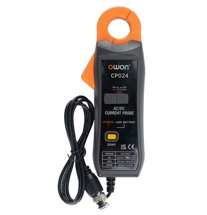 OWON CP024 is a AC/DC current clamp probe for oscilloscopes, supporting AC/DC measurements up to 400 A with a 200 kHz bandwidth for accurate waveform analysis. Non-intrusive clamp design with voltage output, directly connecting to an oscilloscope for safe and fast current measurements. Selectable 4 A / 40 A / 400 A ranges with 10 mA resolution, suitable for both low-current diagnostics and high-power applications.