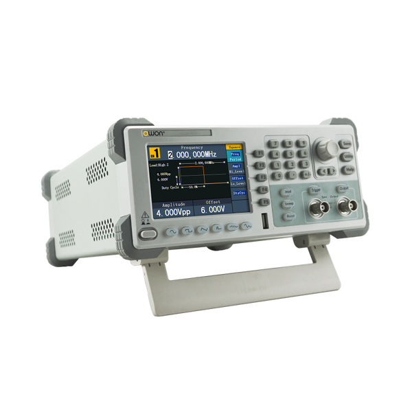 OWON's AG051F 5MHz function generator with advanced DDS technology, 125Ms/s and. The vertical resolution is a high 14 bits. The device can generate the following signals: Sinus, Block, Saw-tooth, Pulse, Noise, Sync, or exponential (rise/decay) or a 32 channel digital wave.
