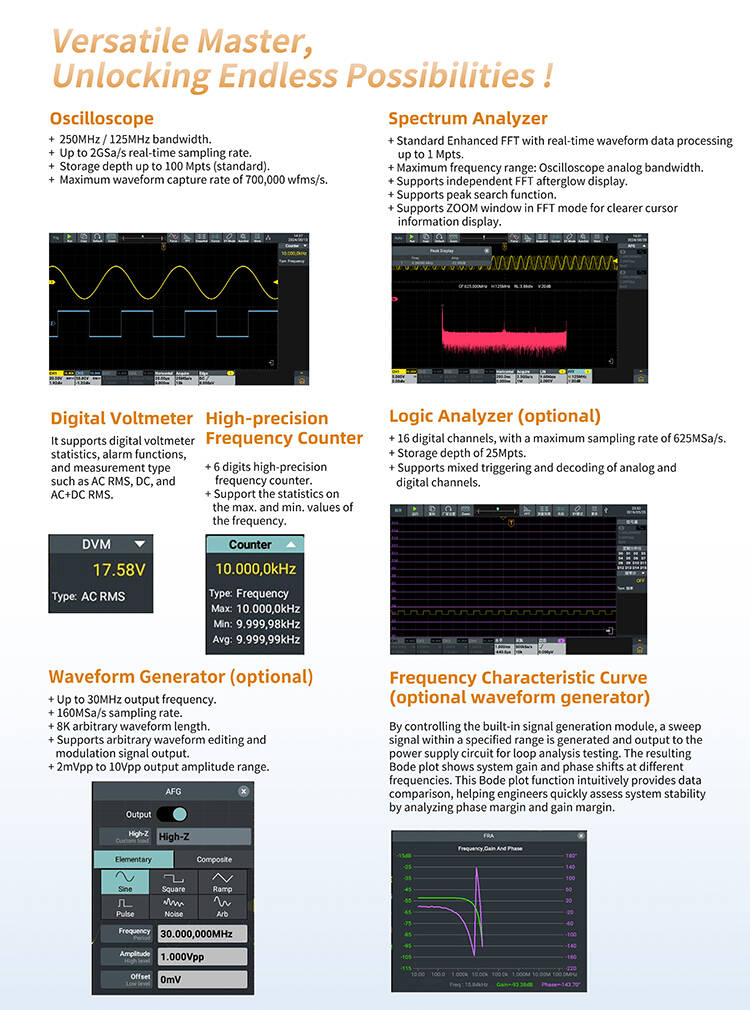 Optional AFG and Logic Analyzer features make it a versatile tool for advanced signal testing and education