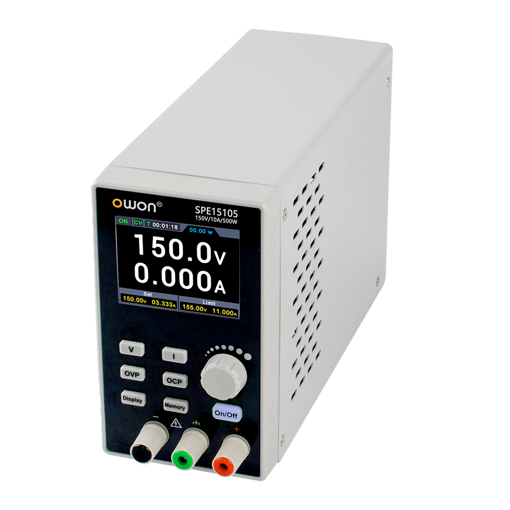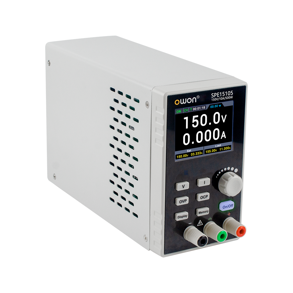 OWON SPE15054 programmable DC power supply with adjustable 0–150 V and 0–5 A output and up to 450 W power. Features high-precision CV/CC operation, 10 mV / 1 mA resolution, low ripple (≤150 mVp-p), 2.8-inch IPS LCD display, programmable output control and USB / RS232 / RS485 connectivity with SCPI support. Designed for electronics laboratories, R&D, automated test systems.